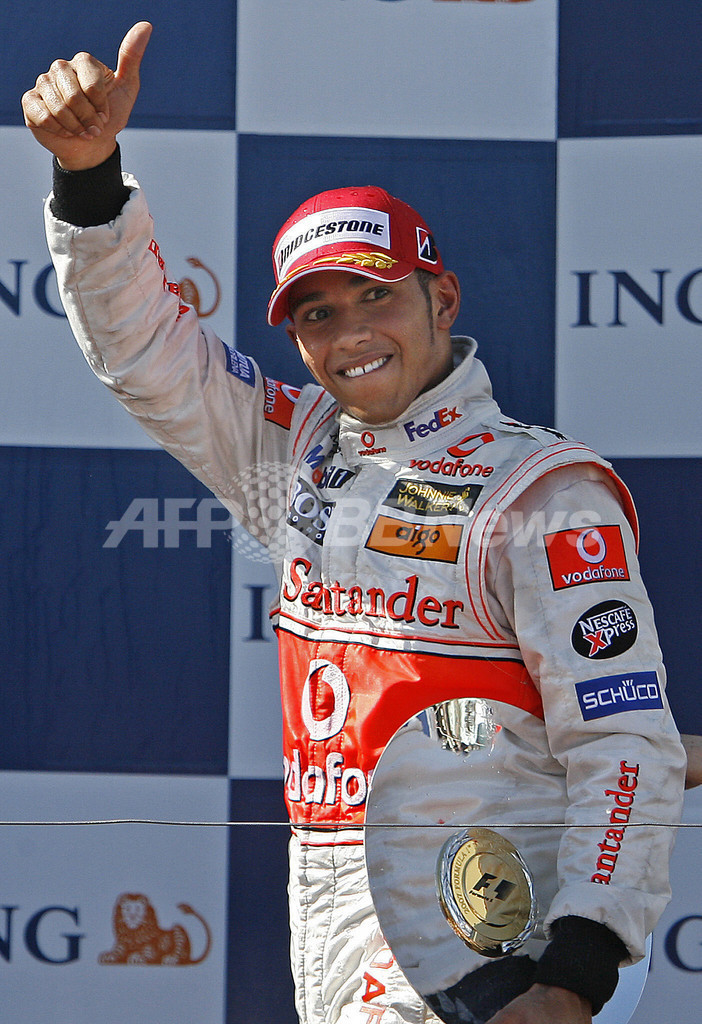 【メルボルン/オーストラリア 18日 AFP】F1・2007年シーズン開幕戦・オーストラリアGP(Australian Grand Prix 2007)・決勝。ポールポジションからスタートしたフェラーリ(Ferrari)のキミ・ライコネン(Kimi Raikkonen)は、2位に入ったマクラーレン・メルセデス(McLaren-Mercedes)のフェルナンド・アロンソ(Fernando Alonso)に7秒2差をつけて、シーズン開幕戦をポール・トゥ・ウィンで飾った。写真は、表彰台で授与されたトロフィーを高々と掲げるライコネン。(c)AFP/Torsten BLACKWOOD