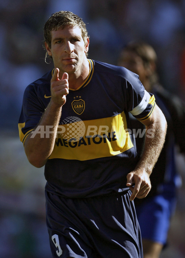 【ブエノスアイレス/アルゼンチン 18日 AFP】サッカー、アルゼンチン1部リーグ・後期第6節、ボカ・ジュニアーズ(Boca Juniors)vsヒムナシア・ラ・プラタ(Gimnasia y Esgrima La Plata)。ボカ・ジュニアーズのマルティン・パレルモ(Martin Palermo)は、4得点(前半6分、9分、14分、後半28分)を挙げる活躍を見せチームの勝利に貢献した。試合はボカ・ジュニアーズが5-1でヒムナシア・ラ・プラタを降し、リーグ4勝目を挙げ勝ち点を13に伸ばした。写真は、3点目のゴールを決めてアピールをするパレルモ。(c)AFP/JUAN MABROMATA