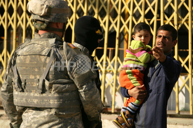 【バグダッド/イラク 19日 AFP】今週、米軍主導の多国籍軍による侵攻開始から4年目を迎えるイラクで、19日に発表された世論調査によると、将来を悲観する市民が増加していることが明らかになった。同調査で、米軍など駐イラク外国軍部隊を「信頼する」と答えたのは全体の2割以下。また、2年前とは対照的に、自宅付近で「安心できる」と答えた市民は全体のわずか26%にとどまったという。写真は同日、通訳を介して米兵に反政府勢力への苦情を申し立てる男性。(c)AFP/Patrick BAZ