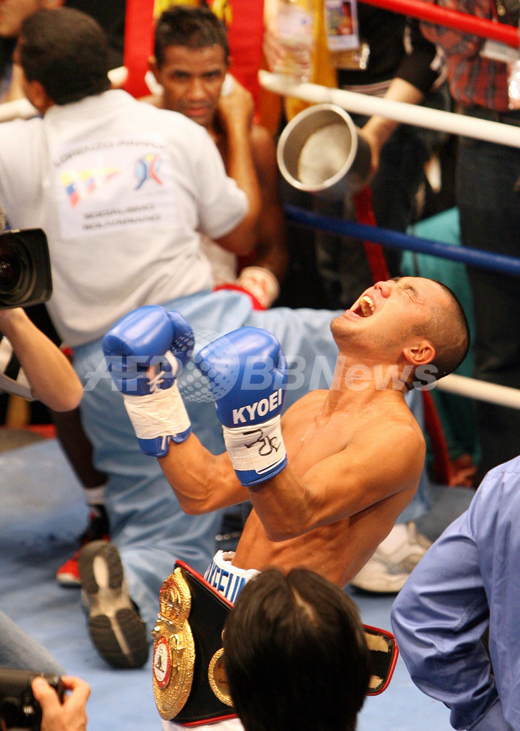 【東京 19日 AFP】ボクシング、WBA世界フライ級タイトルマッチ12回戦。同級3位の坂田健史(Takefumi Sakata、日本)は、前日の計量で体重オーバーにより王座を剥奪された前王者のロレンソ・パーラ(Lorenzo Parra、ベネズエラ)と対戦。試合は3ラウンド14秒にパーラが右肩の負傷のため棄権し、坂田がTKO勝ちを収め同タイトルを奪取した。写真は、パーラに攻め込む坂田(右)。(c)AFP/TOSHIFUMI KITAMURA