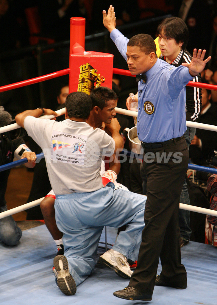 【東京 19日 AFP】ボクシング、WBA世界フライ級タイトルマッチ12回戦。同級3位の坂田健史(Takefumi Sakata、日本)は、前日の計量で体重オーバーにより王座を剥奪された前王者のロレンソ・パーラ(Lorenzo Parra、ベネズエラ)と対戦。試合は3ラウンド14秒にパーラが右肩の負傷のため棄権し、坂田がTKO勝ちを収め同タイトルを奪取した。写真は、パーラに攻め込む坂田(右)。(c)AFP/TOSHIFUMI KITAMURA