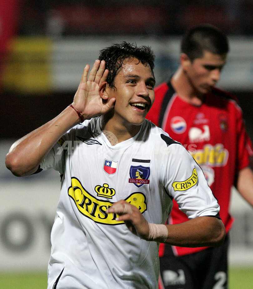 【ククタ/コロンビア 20日 AFP】サッカー、リベルタドーレス杯南米選手権2007(Copa Libertadores de America 2007)・第2ラウンド、グループ6・第3節、カラカス(Caracas FC、ベネズエラ)vsコロコロ(Colo Colo、チリ)。コロコロのアレクシス・サンチェス(Alexis Sanchez)は、ハットトリック(前半20分、後半13分、43分)を記録しチームの勝利に貢献した。試合はコロコロが4-0で快勝し、グループリーグ初白星を挙げた。写真は、ゴールを決めて喜びを表すサンチェス。(c)AFP/Mauricio DUENAS
