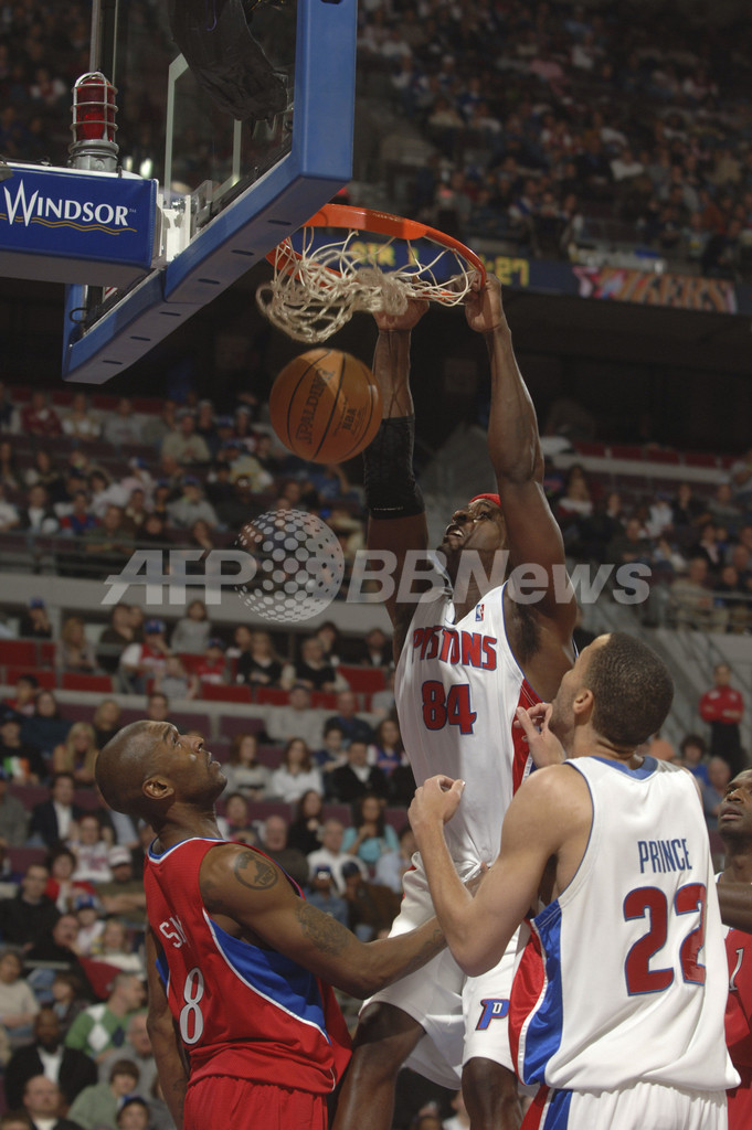 【オーバンヒルズ/米国 20日 AFP】06-07NBA、デトロイト・ピストンズ(Detroit Pistons)vsフィラデルフィア・セブンティシクサーズ(Philadelphia 76ers)。ピストンズのクリス・ウェバー(Chris Webber)はこの試合、9得点7リバウンドでチームに貢献。試合はセブンティシクサーズのフィールドゴール成功率をわずか37.7%に抑えるなど、ディフェンスで圧倒したピストンズが96-75で快勝し、今季43勝目をマークした。写真は、ゴール下からボースハンド・ダンクシュートを決めるウェバー(中央)。(c)AFP/Getty Images/NBAE Allen Einstein