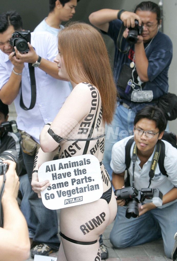 ニュース 環境・科学 PETA、食肉産業に水着で抗議 - タイ 2007年3月21日 15:48 発信地:タイ [ アジア・オセアニア タイ ] このニュースをシェア ‹ › ❮ 2/5 ❯ 写真は同日、肉食に反対するスローガンを掲げるカナダ人のAshley Frunoさん。(c)AFP/PORNCHAI KITTIWONGSAKUL 画像作成中 ! 【バンコク/タイ 21日 AFP】首都バンコク(Bangkok)のショッピングモールで21日、動物愛護団体PETA(People for the Ethical Treatment of Animals)が食肉産業に対する抗議活動を行い、市民に対して菜食を呼びかけた。写真は同日、肉食に反対するスローガンを掲げるカナダ人のAshley Frunoさん。(c)AFP/PORNCHAI KITTIWONGSAKUL 環境・科学 一覧へ> メディア・報道関係・法人の方向け 写真・動画 購入のお問合せ>