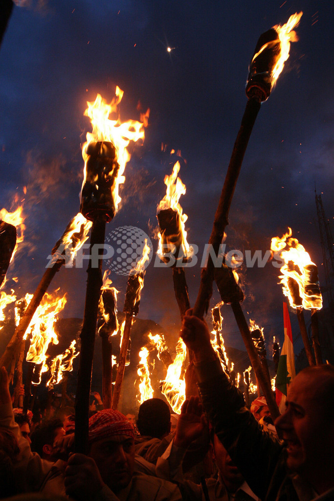ニュース ライフ ゾロアスター教に由来、クルドの新年の祝祭 - イラク 2007年3月21日 17:54 発信地:イラク [ 中東・北アフリカ イラク ] このニュースをシェア ‹ › ❮ 3/4 ❯ 写真は21日早朝、バグダッドから北に500キロメートル離れたアクリの街で、新年を祝うためにたいまつを掲げるクルド人たち。(c)AFP PHOTO/SAFIN HAMED 画像作成中 ! 【Akri/イラク 21日 AFP】イラクに住むクルド人たちの新年の祝祭「Noruz」は、ゾロアスター教に由来している。Noruzは太陽暦の3月21日に始まり、西暦2007年は1386年にあたる。写真は21日早朝、バグダッドから北に500キロメートル離れたアクリの街で、たき火のまわりで踊り、新年を祝うクルド人の少女たち。(c)AFP/SAFIN HAMED ライフ 一覧へ> メディア・報道関係・法人の方向け 写真・動画 購入のお問合せ>
