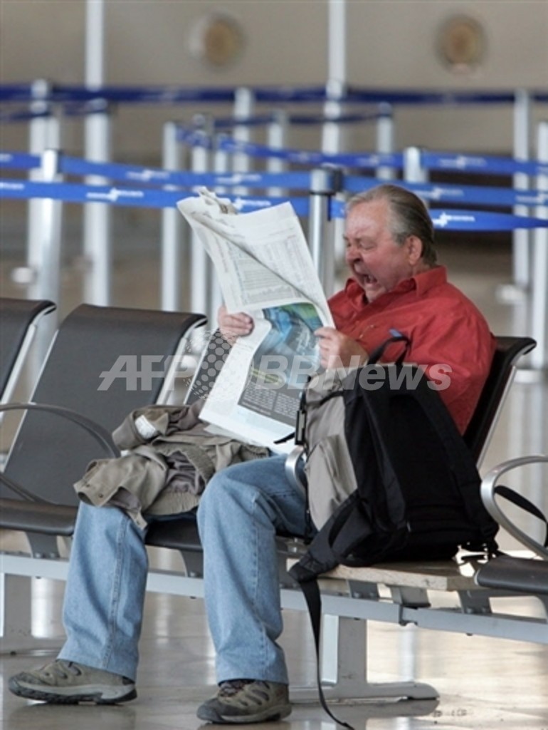 写真は同日、ストで人けのないテルアビブ(Tel Aviv)のベングリオン国際空港(Ben Gurion Airport)の待合いロビーで、1人新聞を読む男性。(c)AFP/YOAV LEMMER