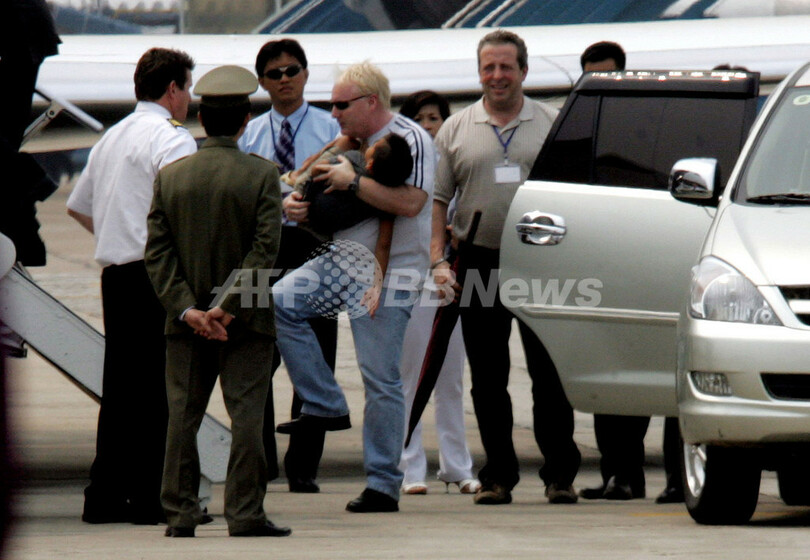 写真は同日、ハノイのノイバイ(Noi Bai)空港で、ボディーガードに抱ジェット機に乗り込むマドックス君。(c)AFP