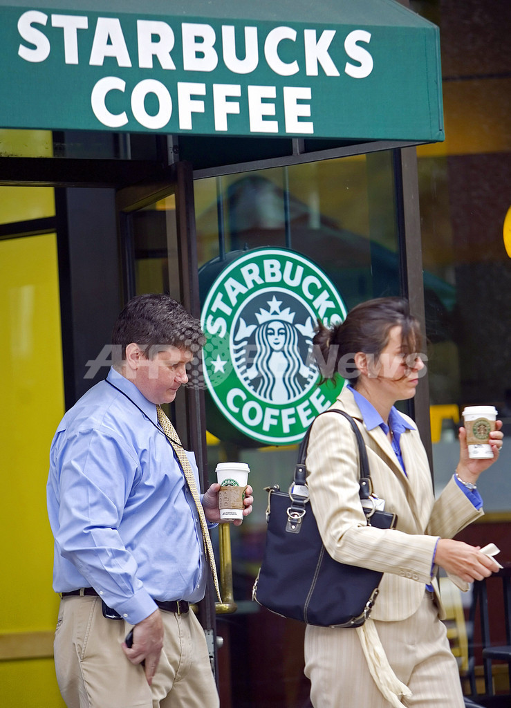 写真は、首都ワシントンD.C.のスターバックスと、コーヒーを手に店を出る客。(c)AFP/Paul J.Richards