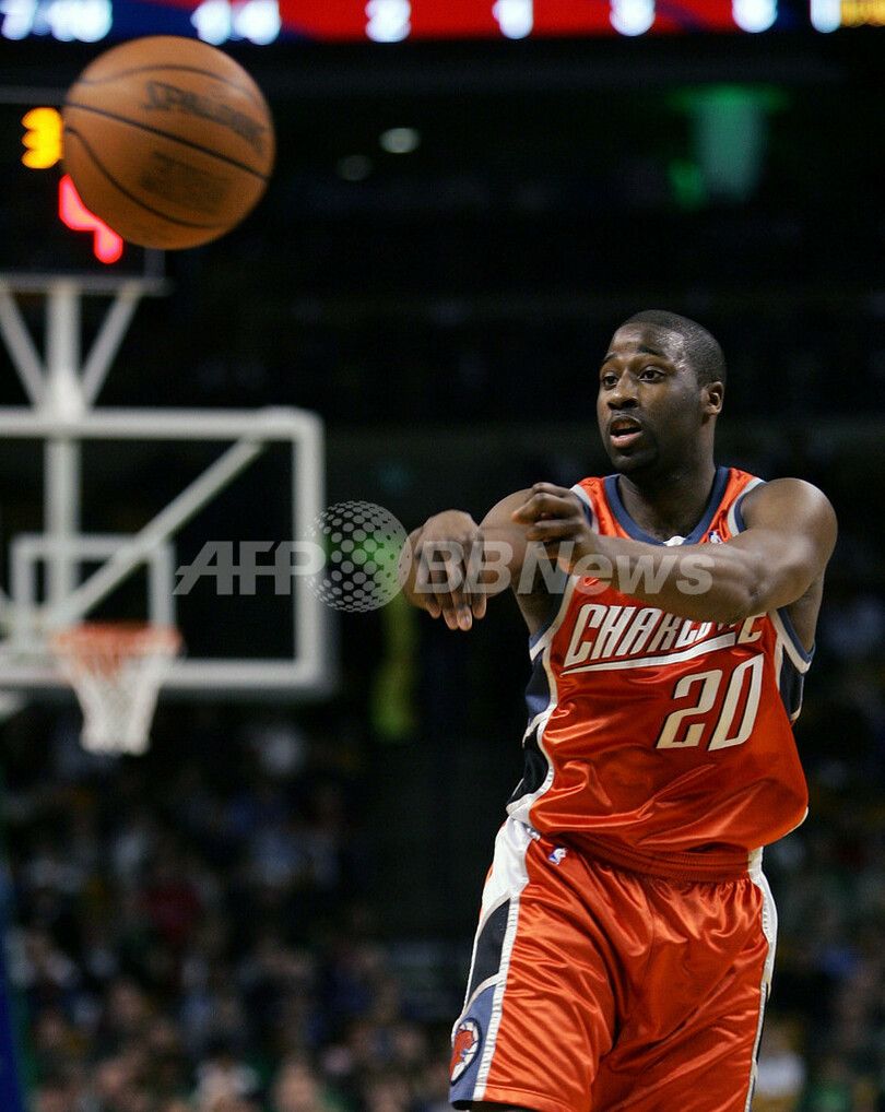【ボストン/米国 21日 AFP】06-07NBA、ボストン・セルティックス(Boston Celtics)vsシャーロット・ボブキャッツ(Charlotte Bobcats)。ボブキャッツのレイモンド・フェルトン(Raymond Felton)は、チームハイとなる19得点を挙げる活躍でチームの勝利に貢献した。試合は第4Qに逆転したボブキャッツが92-84でセルティックスを降し、2連勝で今季26勝目を挙げた。写真は、パスを出すフェルトン。(c)AFP/Getty Images Elsa