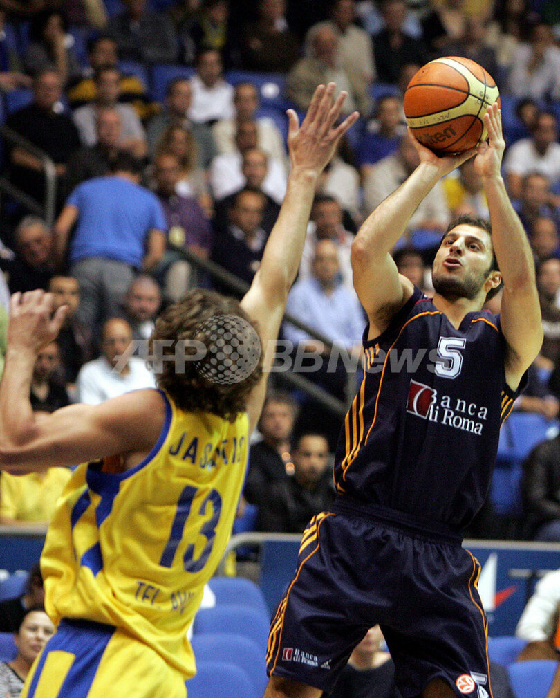 【テルアビブ/イスラエル 22日 AFP】バスケットボール、ユーロリーグ・TOP16・グループD・第6節、マッカビ・テルアビブ(Maccabi Tel-Aviv)vsロットマティカ・ウィルトゥース・ローマ(Lottomatica Virtus Roma)。マッカビ・テルアビブのニコラ・ブヤシッチ(Nikola Vujcic)はウィルトゥース・ローマのルカ・ガリ(Luca Garri、右)をかわしてインサイドに切り込む。試合は79-72でマッカビ・テルアビブが勝利して勝敗を4勝2敗としグループ2位で決勝トーナメント進出を決めた。(c)AFP/YOAV LEMMER