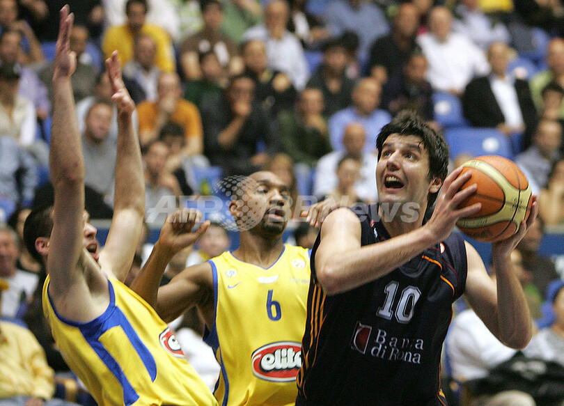 【テルアビブ/イスラエル 22日 AFP】バスケットボール、ユーロリーグ・TOP16・グループD・第6節、マッカビ・テルアビブ(Maccabi Tel-Aviv)vsロットマティカ・ウィルトゥース・ローマ(Lottomatica Virtus Roma)。マッカビ・テルアビブのニコラ・ブヤシッチ(Nikola Vujcic)はウィルトゥース・ローマのルカ・ガリ(Luca Garri、右)をかわしてインサイドに切り込む。試合は79-72でマッカビ・テルアビブが勝利して勝敗を4勝2敗としグループ2位で決勝トーナメント進出を決めた。(c)AFP/YOAV LEMMER