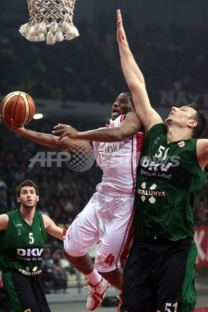 【アテネ/ギリシャ 22日 AFP】バスケットボール、ユーロリーグ・TOP16・グループE・最終第6節、オリンピアコス(Olympiacos)vsDKVホベントゥット(DKV Joventut)。試合はオリンピアコスが81-65でDKVホベントゥットを降し、通算成績3勝3敗のグループ2位となり、決勝トーナメント進出を果たした。写真は、DKVホベントゥットのAndy Betts(右)のブロックをかわしシュートを放つオリンピアコスのジェームス・ペン(James Penn、中央)。(c)AFP/ARIS MESSINIS