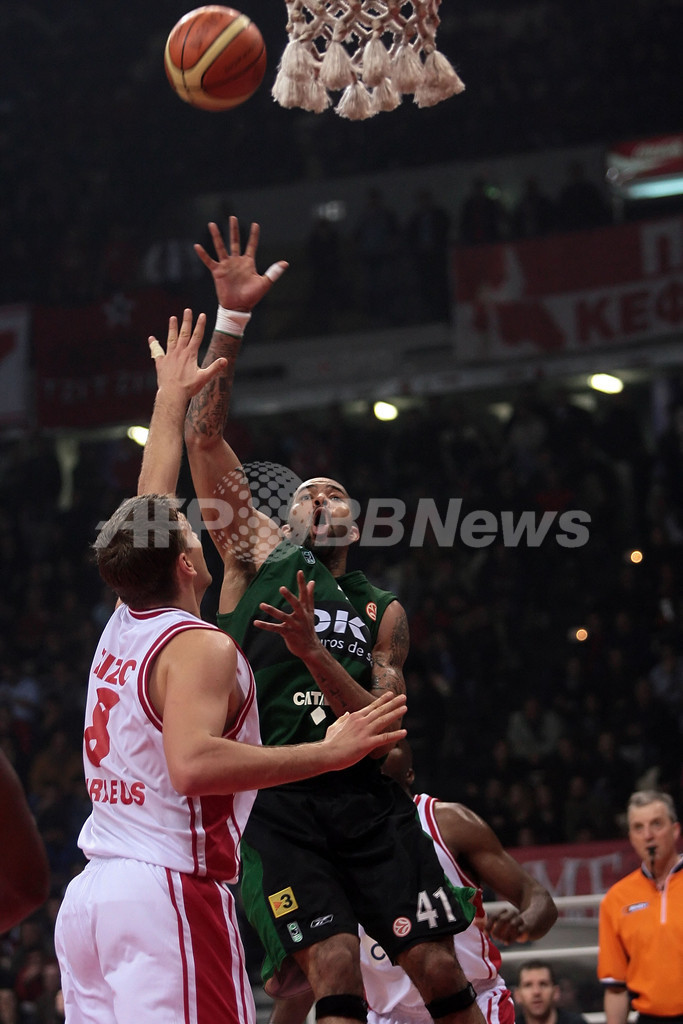 【アテネ/ギリシャ 22日 AFP】バスケットボール、ユーロリーグ・TOP16・グループE・最終第6節、オリンピアコス(Olympiacos)vsDKVホベントゥット(DKV Joventut)。試合はオリンピアコスが81-65でDKVホベントゥットを降し、通算成績3勝3敗のグループ2位となり、決勝トーナメント進出を果たした。写真は、DKVホベントゥットのAndy Betts(右)のブロックをかわしシュートを放つオリンピアコスのジェームス・ペン(James Penn、中央)。(c)AFP/ARIS MESSINIS