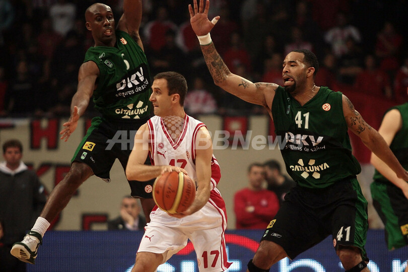 【アテネ/ギリシャ 22日 AFP】バスケットボール、ユーロリーグ・TOP16・グループE・最終第6節、オリンピアコス(Olympiacos)vsDKVホベントゥット(DKV Joventut)。試合はオリンピアコスが81-65でDKVホベントゥットを降し、通算成績3勝3敗のグループ2位となり、決勝トーナメント進出を果たした。写真は、DKVホベントゥットのAndy Betts(右)のブロックをかわしシュートを放つオリンピアコスのジェームス・ペン(James Penn、中央)。(c)AFP/ARIS MESSINIS