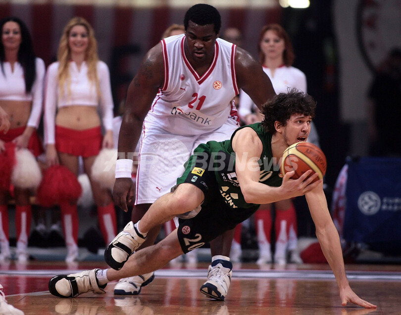 【アテネ/ギリシャ 22日 AFP】バスケットボール、ユーロリーグ・TOP16・グループE・最終第6節、オリンピアコス(Olympiacos)vsDKVホベントゥット(DKV Joventut)。試合はオリンピアコスが81-65でDKVホベントゥットを降し、通算成績3勝3敗のグループ2位となり、決勝トーナメント進出を果たした。写真は、DKVホベントゥットのAndy Betts(右)のブロックをかわしシュートを放つオリンピアコスのジェームス・ペン(James Penn、中央)。(c)AFP/ARIS MESSINIS