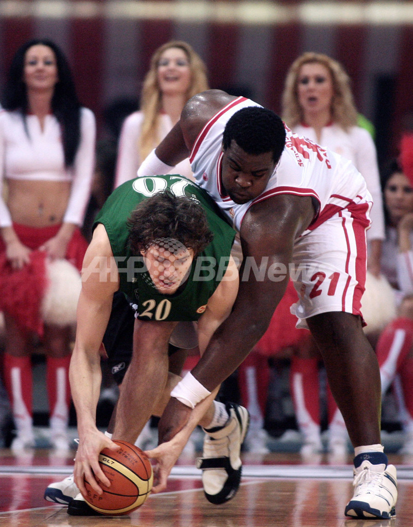 【アテネ/ギリシャ 22日 AFP】バスケットボール、ユーロリーグ・TOP16・グループE・最終第6節、オリンピアコス(Olympiacos)vsDKVホベントゥット(DKV Joventut)。試合はオリンピアコスが81-65でDKVホベントゥットを降し、通算成績3勝3敗のグループ2位となり、決勝トーナメント進出を果たした。写真は、DKVホベントゥットのAndy Betts(右)のブロックをかわしシュートを放つオリンピアコスのジェームス・ペン(James Penn、中央)。(c)AFP/ARIS MESSINIS