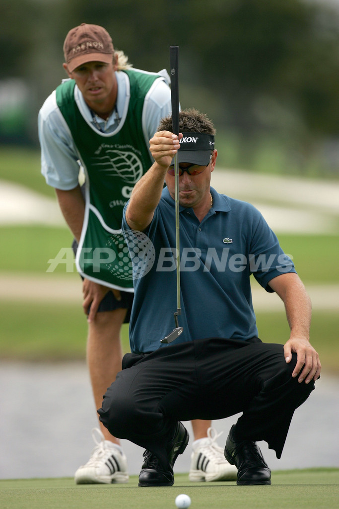 写真は、17番で慎重にラインを読むアレンビー。(c)AFP/Getty Images David Cannon