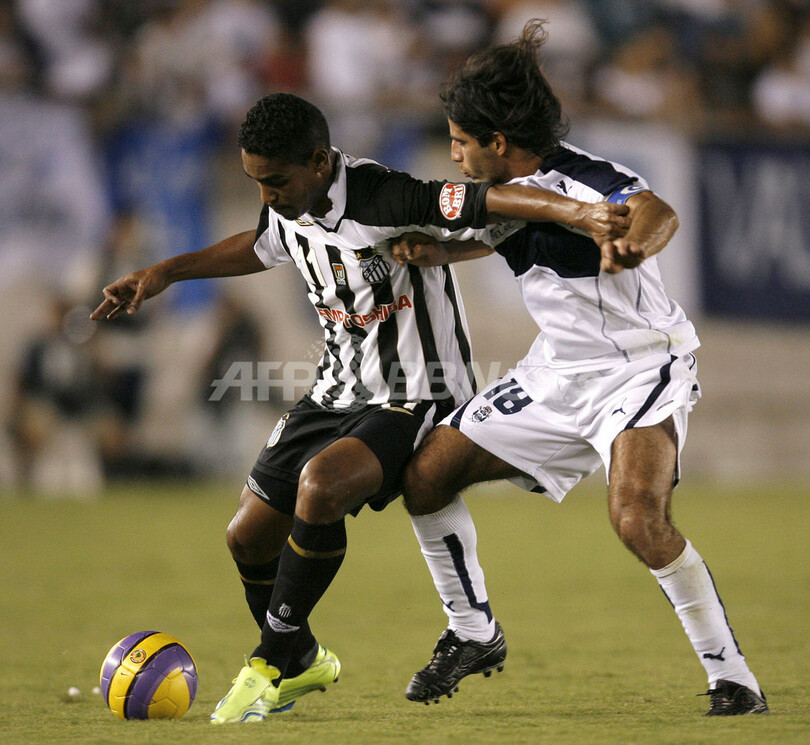 【ラプラタ/アルゼンチン 22日 AFP】サッカー、リベルタドーレス杯南米選手権2007(Copa Libertadores de America 2007)・第2ラウンド、グループ8・第4節、ヒムナシア・ラ・プラタ(Gimnasia y Esgrima La Plata、アルゼンチン)vsサントスFC(Santos FC、ブラジル)。サントスのマルコス・アウレリオ(Marcos Aurelio)は、前半2分に先制ゴールを決めてチームの勝利に貢献した。試合はサントスが2-1でヒムナシア・ラ・プラタを降し、4連勝を飾り勝ち点を12に伸ばした。写真は、先制ゴールを決めて喜ぶアウレリオ。(c)AFP/JUAN MABROMATA