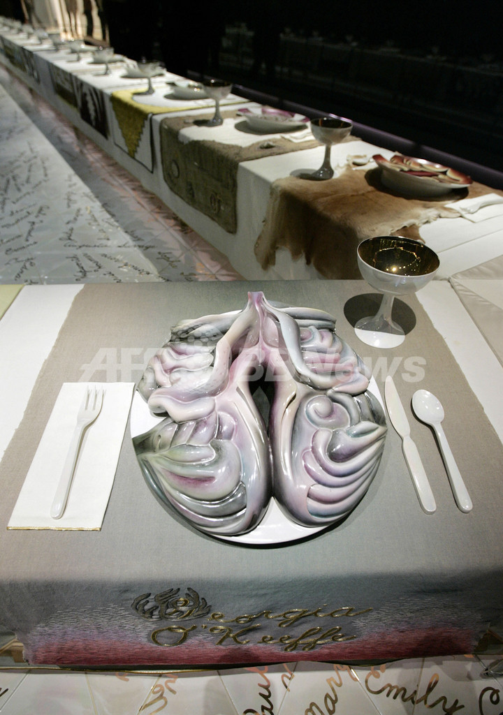 【ニューヨーク/米国 24日 AFP】ブルックリン美術館(Brooklyn Museum)内に23日、新しくフェミニスト・アートの展示場、「Elizabeth A. Sackler Center for Feminist Art」がオープンした。これは国内に初めて開設される公共のフェミニスト・アート・スペースだ。写真は22日の内覧会で公開されたアーティスト、ジュディ・シカゴ(Judy Chicago)による常設展示作品、「The Dinner Party」(1979年)。(c)AFP/Stan HONDA