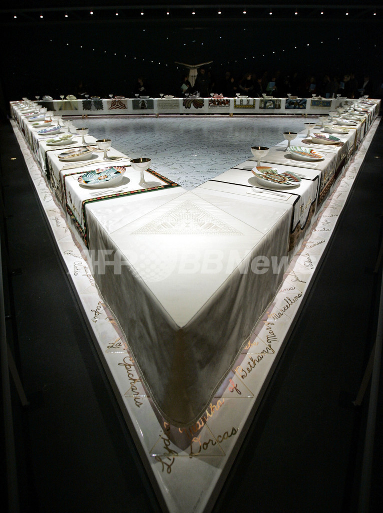 【ニューヨーク/米国 24日 AFP】ブルックリン美術館(Brooklyn Museum)内に23日、新しくフェミニスト・アートの展示場、「Elizabeth A. Sackler Center for Feminist Art」がオープンした。これは国内に初めて開設される公共のフェミニスト・アート・スペースだ。写真は22日の内覧会で公開されたアーティスト、ジュディ・シカゴ(Judy Chicago)による常設展示作品、「The Dinner Party」(1979年)。(c)AFP/Stan HONDA
