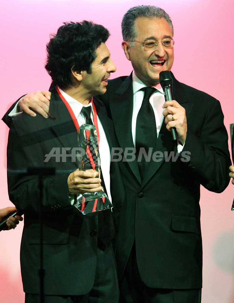 【ラスベガス/米国 24日 AFP】音楽著作権管理団体、BMI(Broadcast Music Incorporated)主催の優れた楽曲に贈られる「2007BMIラテン・ミュージック・アウォード(2007 BMI Latin Music Awards)」の授賞式が23日、ベネチアン(The Venetian Resort-Hotel-Casino)で開催され、メキシコ出身の人気バンド、ロス・ティグレス・デル・ノルテ(Los Tigres Del Norte)がBMIアイコン賞を受賞した。写真はBMIの会長兼CEO、デル・ブライアント(Del Bryant、左2)から賞を受賞するロス・ティグレス・デル・ノルテのメンバー(左から)Luis Hernandez、Jorge Hernandez、Eduardo Hernandez、Oscar Lara、Hernan Hernandez。(c)AFP/Getty Images Ethan Miller