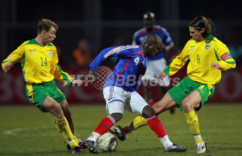 【カウナス/リトアニア 24日 AFP】サッカー、欧州選手権2008(Euro 2008)・予選グループB、リトアニアvsフランス。試合は両チーム無得点で迎えた後半28分にニコラ・アネルカ(Nicolas Anelka)が決勝点を挙げたフランスが1-0で勝利を収め、通算成績を4勝1敗としてグループ首位の座をキープした。写真は、アネルカ(左2)の下に駆け寄るジブリル・シセ(Djibril Cisse、左)、ウィリー・サニョル(Willy Sagnol、右2)、ラサナ・ディアッラ(Lassana Diarra、右)。(c)AFP/FRANCK FIFE