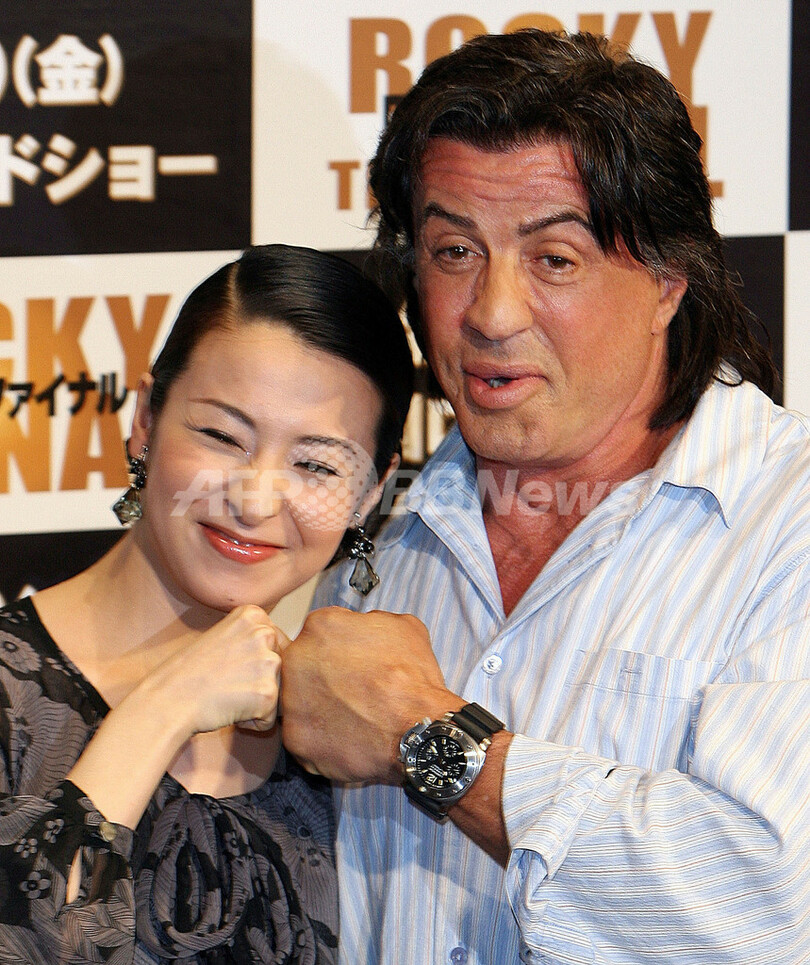 【東京 26日 AFP】「ロッキー」シリーズ完結作「ロッキー・ザ・ファイナル(Rocky Balboa)」のPRのため来日中の俳優シルベスター・スタローン(Sylvester Stallone)が26日、都内のホテルで会見を行なった。会場には檀れい(Rei Dan)が応援に駆けつけ、スタローンとともに、4月20日から全国公開となる同作品をPRした。写真は、カメラに向かいポーズをとるスタローン(右)と壇。(c)AFP/TOSHIFUMI KITAMURA