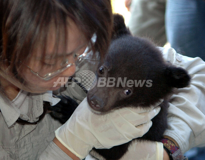 【南投/台湾 26日 AFP】生物学者でもある国立屏東科技大学(National Pingtung University of Science and Technology)、野生動物保育研究所(Institute of Wildlife Conservation)の黄美秀(Hwang Mei-hsiu)助教授は、台湾におけるタイワンクロクマ保護の第一人者である。絶滅の危機にひんしているタイワンクロクマの保護にかける情熱から地元の人からは「クマのお母さん」と呼ばれている。写真は、南投(Nantou)にある固有種の研究施設、特有生物研究保育中心(Endemic Species Research Institute)で生後間もないタイワンクロクマの子どもを抱く黄助教授(撮影日不明)。(c)AFP/Endemic Species Research Institute