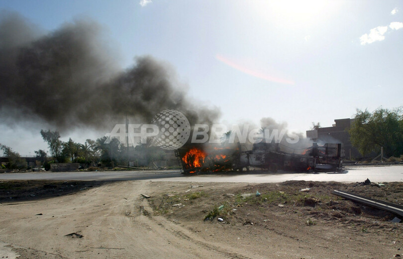 写真は同日、バグダッド市内のアダミヤ地区で、米軍部隊を標的に攻撃を仕掛け、炎上したトラック。(c)AFP/WISAM SAMI