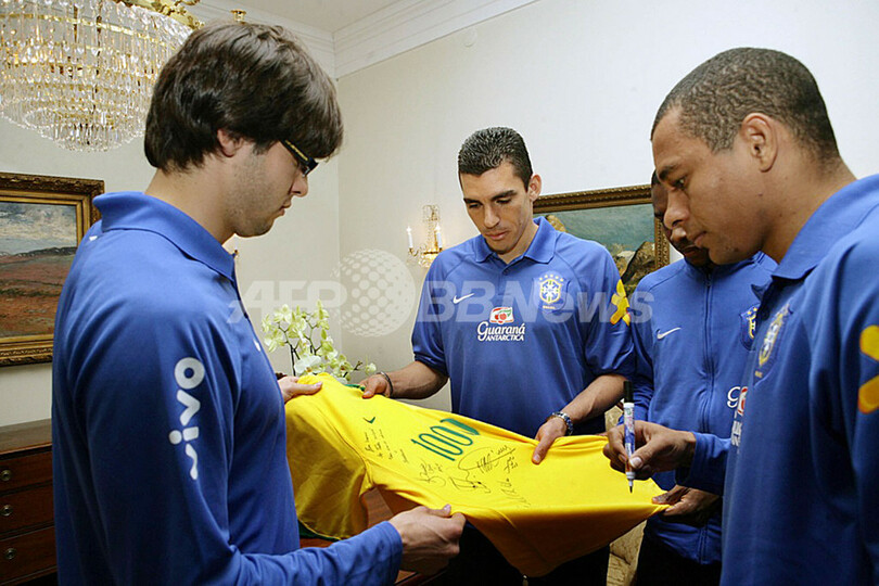 【ストックホルム/スウェーデン 27日 AFP】サッカー、親善試合のためにスウェーデンを訪れているブラジル代表が、自身通算1000ゴールにあと1に迫っている元同国代表で現在はバスコ・ダ・ガマ(Vasco da Gama)に所属するFWロマーリオ(Romario)のために、代表ユニフォームにサインをしエールを送った。ロマーリオは、25日に行われたリオ・デ・ジャネイロ州選手権(Carioca championship)リオ杯の対フラメンゴ(Clube de Regatas do Flamengo)戦でゴールを決め自身通算999点目を記録し通算1000ゴールの偉業に王手をかけている。写真は、ユニフォームにサインをする(左から)カカ(Kaka)、ルシオ(Lucio)、ジルベルト・シウヴァ(Gilberto Silva)。(c)AFP/CBF