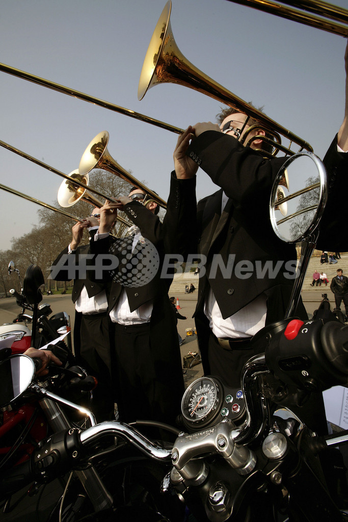 【ロンドン/英国 29日 AFP】バイクにまたがるメンバーらがパフォーマンスを披露するオーケストラ、Bennetts Bike Orchestraが28日、ロイヤル・アルバートホール(Royal Albert Hall)の屋外で演奏会を開催した。Stephen Montagueが指揮を務めた同オーケストラは「SE10 Brass」や「Revs for a Reason」などから集まった演奏者やライダーで構成され、路上でのバイク事故に対する注意を喚起した。(c)AFP/Edmond Terakopian