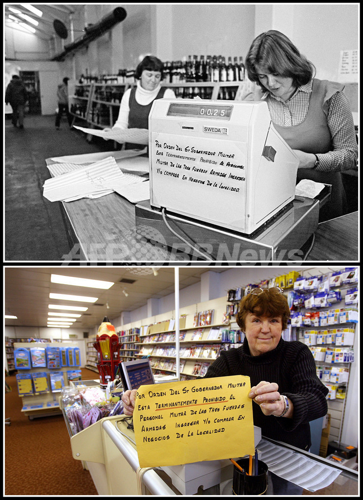 写真は、25年の歳月を経たフォークランド諸島スタンリー湾(Stanley Bay)の風景。(上、軍需物資を運搬するアルゼンチン兵、1982年4月13日撮影。下、同じ場所を歩くドイツ人観光客ら、2007年3月24日撮影)(c)AFP/DANIEL GARCIA