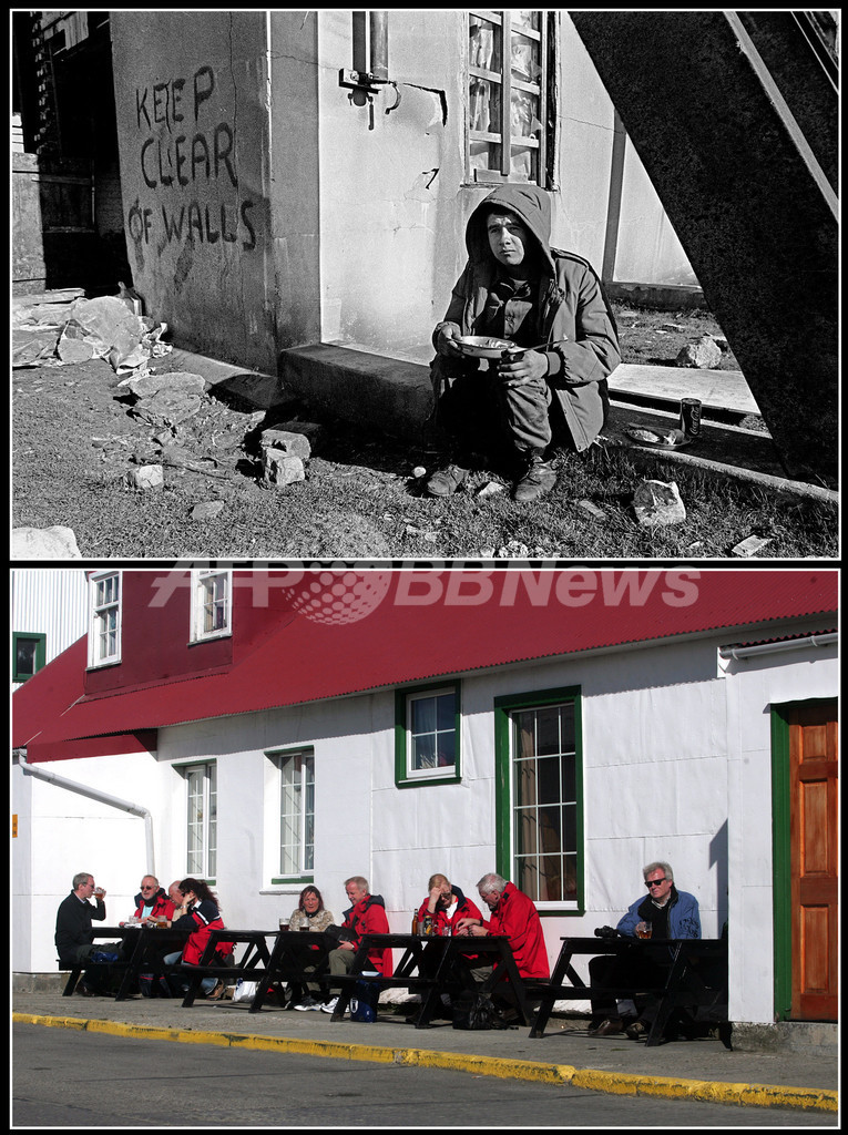 写真は、25年の歳月を経たフォークランド諸島スタンリー湾(Stanley Bay)の風景。(上、軍需物資を運搬するアルゼンチン兵、1982年4月13日撮影。下、同じ場所を歩くドイツ人観光客ら、2007年3月24日撮影)(c)AFP/DANIEL GARCIA
