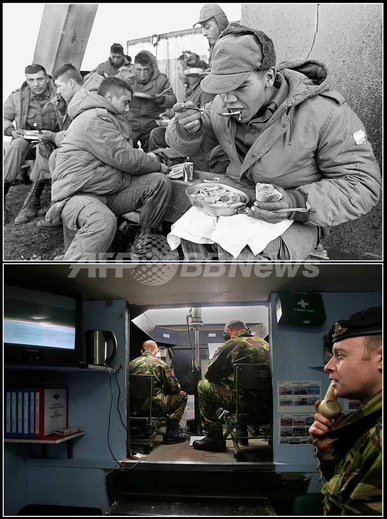 写真は、25年の歳月を経たフォークランド諸島スタンリー湾(Stanley Bay)の風景。(上、軍需物資を運搬するアルゼンチン兵、1982年4月13日撮影。下、同じ場所を歩くドイツ人観光客ら、2007年3月24日撮影)(c)AFP/DANIEL GARCIA