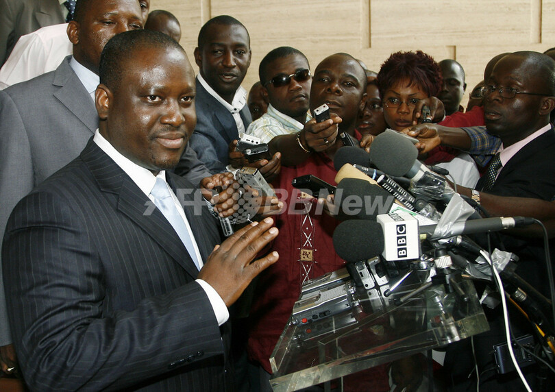 【アビジャン/コートジボワール 30日 AFP】ローラン・バグボ(Laurent Gbagbo)大統領は29日、反政府組織「新勢力(Forces Nouvelles、FN)」指導者で自身の旧敵であるギヨーム・ソロ(Guillaume Soro)氏を首相に公式指名した。バグボ大統領の報道官によると、ソロ氏の首相指名は両者による和平協定の一環だという。写真は同日、バグボ大統領との会談後にアビジャン(Abidjan)で記者会見するソロ次期首相。(c)AFP