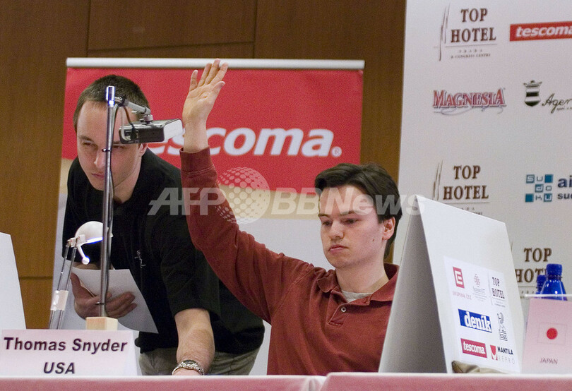 【プラハ/チェコ 31日 AFP】プラハ(Prague)で開催されていた数字のパズルゲーム「SUDOKU(数独)」の世界選手権が31日、3日間の熱戦を終え、幕を閉じた。優勝者はハーバード大学(Harvard University)の学生、Thomas Snyderさん。2位で135ポイントの楠井悠平さんを上回る162ポイントを獲得した。同大会には141人が参加。写真は優勝したSnyderさん。(c)AFP/MICHAL URES