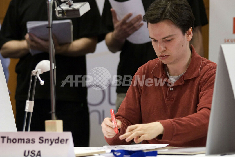 【プラハ/チェコ 31日 AFP】プラハ(Prague)で開催されていた数字のパズルゲーム「SUDOKU(数独)」の世界選手権が31日、3日間の熱戦を終え、幕を閉じた。優勝者はハーバード大学(Harvard University)の学生、Thomas Snyderさん。2位で135ポイントの楠井悠平さんを上回る162ポイントを獲得した。同大会には141人が参加。写真は優勝したSnyderさん。(c)AFP/MICHAL URES