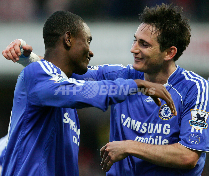 【ワトフォード/英国 31日 AFP】サッカー、イングランド・プレミアリーグ・第31節、ワトフォード(Watford)vsチェルシー(Chelsea)。試合は後半ロスタイムにサロモン・カルー(Salomon Kalou)が決勝点を挙げたチェルシーが1-0で最下位ワトフォードに競り勝ち、7連勝を飾り首位マンチェスター・ユナイテッド(Manchester United)との勝ち点差6をキープした。写真は、フランク・ランパード(Frank Lampard、右)から祝福を受けるカルー。(c)AFP/CARL DE SOUZA