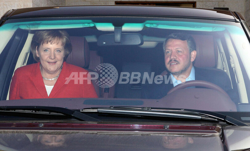 写真は3月31日、アブドラ・ビン・フセイン(King Abdullah II)ヨルダン国王(右)が運転する自動車に同乗し、アカバ(Aqaba)に到着するメルケル独首相(ヨルダン王室提供)。(c)AFP
