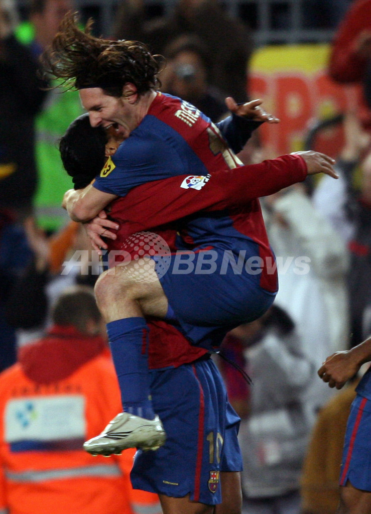 写真は、前半45分に先制のゴールを決めてロナウジーニョに抱き着くメッシ(右)。(c)AFP/LLUIS GENE