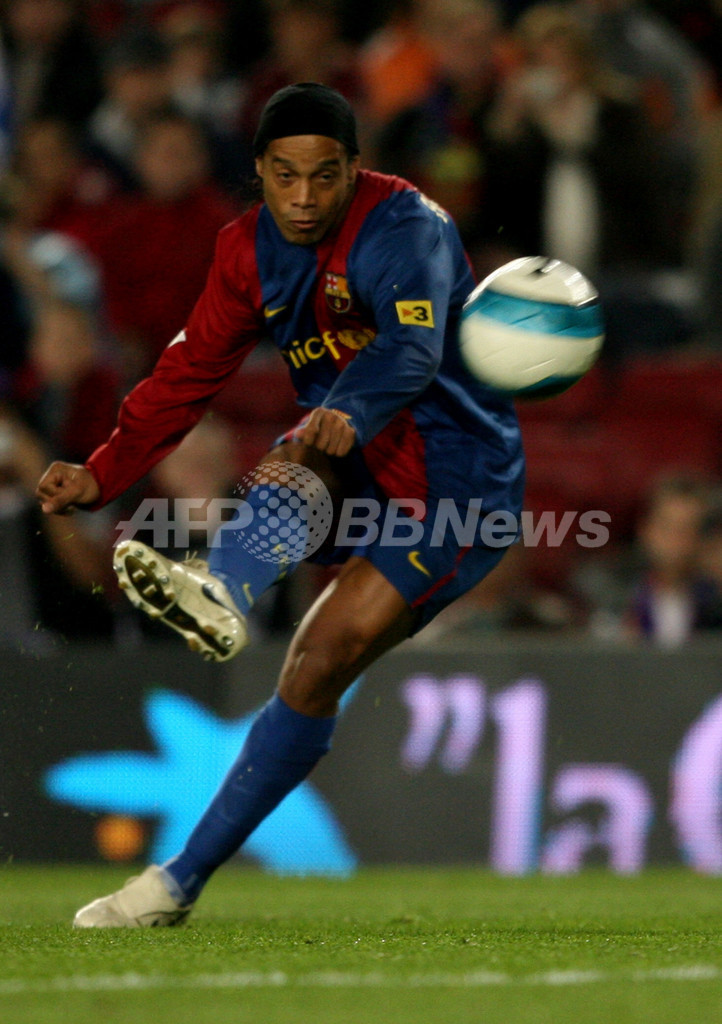 写真は、前半45分に先制のゴールを決めてロナウジーニョに抱き着くメッシ(右)。(c)AFP/LLUIS GENE
