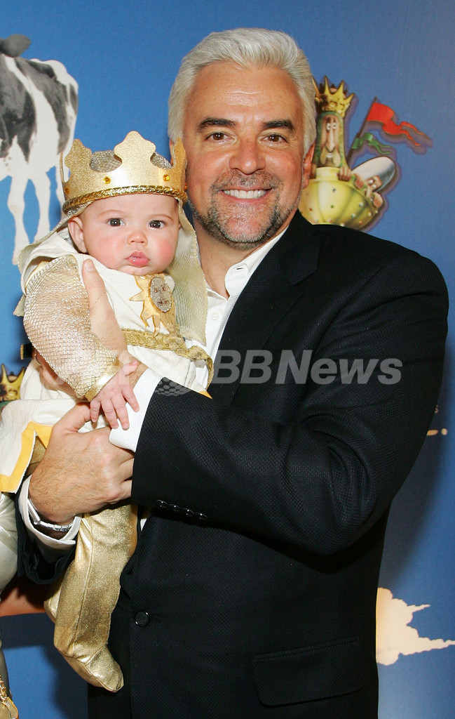【ラスベガス/米国 1日 AFP】伝説的コメディ・グループ、モンティ・パイソン(Monty Python)のコメディミュージカル「Monty Python’s Spamalot」が31日、ウィン・ラスベガス(Wynn Las Vegas)でプレミア公演を迎え、キャストや関係者らが駆けつけた。写真は、3か月になる息子ウィリアム・オハーリー(William O’Hurley)君を抱きかかえポーズをとる、主役のアーサー王(King Arthur)役のジョン・オハーリー(John O’Hurley)。(c)AFP/Getty Images Ethan Miller