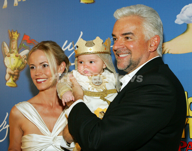 【ラスベガス/米国 1日 AFP】伝説的コメディ・グループ、モンティ・パイソン(Monty Python)のコメディミュージカル「Monty Python’s Spamalot」が31日、ウィン・ラスベガス(Wynn Las Vegas)でプレミア公演を迎え、キャストや関係者らが駆けつけた。写真は、3か月になる息子ウィリアム・オハーリー(William O’Hurley)君を抱きかかえポーズをとる、主役のアーサー王(King Arthur)役のジョン・オハーリー(John O’Hurley)。(c)AFP/Getty Images Ethan Miller