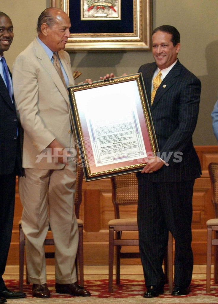 写真は、首都サントドミンゴ(Santo Domingo)で上院議員のアレハンドロ・ウィリアム(Alejandro William)氏より感謝状を受け取るデ・ラ・レンタ氏(左)。(c)AFP/Ricardo HERNADEZ