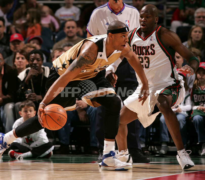【ミルウォーキー/米国 1日 AFP】06-07NBA、ミルウォーキー・バックス(Milwaukee Bucks)vsワシントン・ウィザーズ(Washington Wizards)。ウィザーズのカロン・バトラー(Caron Butler)は、この試合19得点を記録してチームの勝利に貢献した。試合はウィザーズが121-107でバックスに勝利し、シーズン39勝目を挙げた。写真は、バックスのルーベン・パターソン(Ruben Patterson)にドリブルを仕掛けるバトラー(左)。(c)AFP/Getty Images Jonathan Daniel