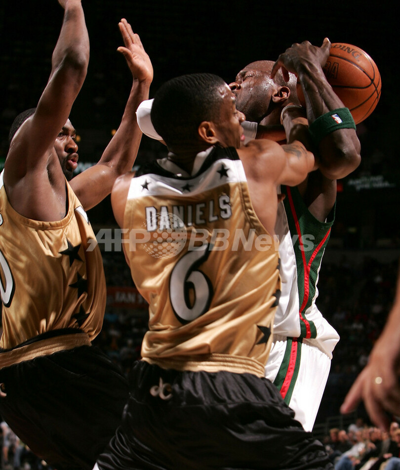 【ミルウォーキー/米国 1日 AFP】06-07NBA、ミルウォーキー・バックス(Milwaukee Bucks)vsワシントン・ウィザーズ(Washington Wizards)。ウィザーズのカロン・バトラー(Caron Butler)は、この試合19得点を記録してチームの勝利に貢献した。試合はウィザーズが121-107でバックスに勝利し、シーズン39勝目を挙げた。写真は、バックスのルーベン・パターソン(Ruben Patterson)にドリブルを仕掛けるバトラー(左)。(c)AFP/Getty Images Jonathan Daniel