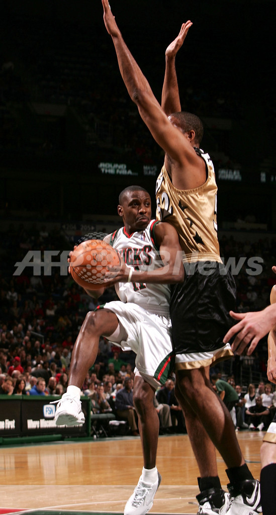【ミルウォーキー/米国 1日 AFP】06-07NBA、ミルウォーキー・バックス(Milwaukee Bucks)vsワシントン・ウィザーズ(Washington Wizards)。ウィザーズのカロン・バトラー(Caron Butler)は、この試合19得点を記録してチームの勝利に貢献した。試合はウィザーズが121-107でバックスに勝利し、シーズン39勝目を挙げた。写真は、バックスのルーベン・パターソン(Ruben Patterson)にドリブルを仕掛けるバトラー(左)。(c)AFP/Getty Images Jonathan Daniel