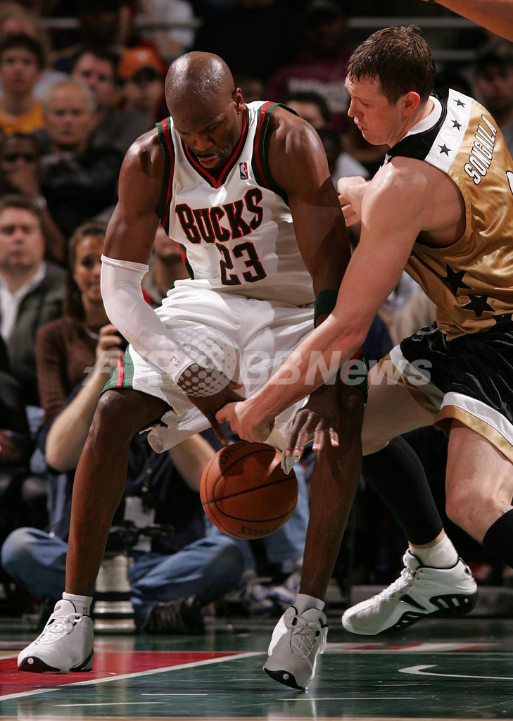 【ミルウォーキー/米国 1日 AFP】06-07NBA、ミルウォーキー・バックス(Milwaukee Bucks)vsワシントン・ウィザーズ(Washington Wizards)。ウィザーズのカロン・バトラー(Caron Butler)は、この試合19得点を記録してチームの勝利に貢献した。試合はウィザーズが121-107でバックスに勝利し、シーズン39勝目を挙げた。写真は、バックスのルーベン・パターソン(Ruben Patterson)にドリブルを仕掛けるバトラー(左)。(c)AFP/Getty Images Jonathan Daniel
