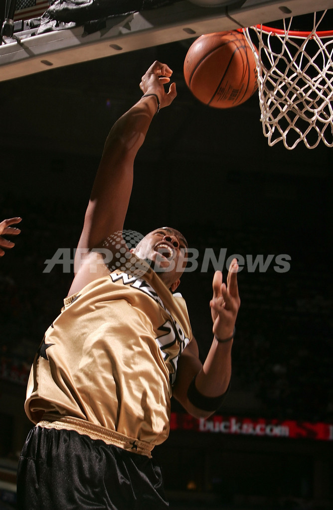【ミルウォーキー/米国 1日 AFP】06-07NBA、ミルウォーキー・バックス(Milwaukee Bucks)vsワシントン・ウィザーズ(Washington Wizards)。ウィザーズのカロン・バトラー(Caron Butler)は、この試合19得点を記録してチームの勝利に貢献した。試合はウィザーズが121-107でバックスに勝利し、シーズン39勝目を挙げた。写真は、バックスのルーベン・パターソン(Ruben Patterson)にドリブルを仕掛けるバトラー(左)。(c)AFP/Getty Images Jonathan Daniel