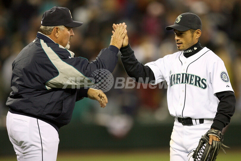 【シアトル/米国 2日 AFP】07MLB、シアトル・マリナーズ(Seattle Mariners)vsオークランド・アスレチックス(Oakland Athletics)。1番・中堅で先発出場したマリナーズのイチロー(Ichiro)は4打数1安打を記録した。試合はマリナーズが4-0でアスレチックスに勝利し、開幕戦を白星で飾った。写真は、マイク・ハーグローヴ(Mike Hargrove)監督から祝福を受けるイチロー(右)。(c)AFP/Getty Images Otto Greule Jr
